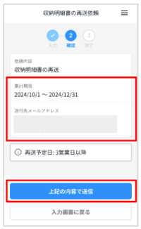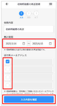 - [集計期間] を入力し、 [送付先メールアドレス] を選択のうえ、[入力内容を確認] をタップする