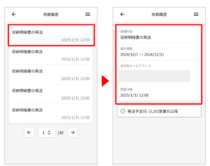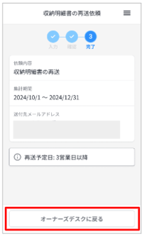 A. 通常、再送依頼日から3営業日以内に指定のメールアドレスに届きます。また、過去の明細書も申請可能ですが、明細書を発行していない期間を指定された場合は送付されませんのでご注意ください。