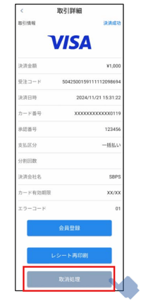 - 取引詳細画面で、レシート内容と取引内容が一致していることを確認し、[ 取消処理 ]を押す