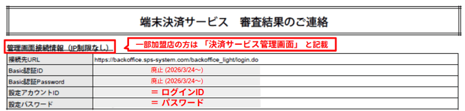 2026/03/24 管理画面のログイン方法がわからない(据置端末向け) お手元に、審査結果通知書をご用意ください。 その後、管理画面にアクセスし、ログインIDに「設定アカウントID」を、パスワードに「設定パスワード」を入力し、「ログイン」をクリックしてください。 詳細はこちらをご覧ください。 ※2026/3/24~、ログイン方法を変更しました。詳細はこちらをご覧ください。